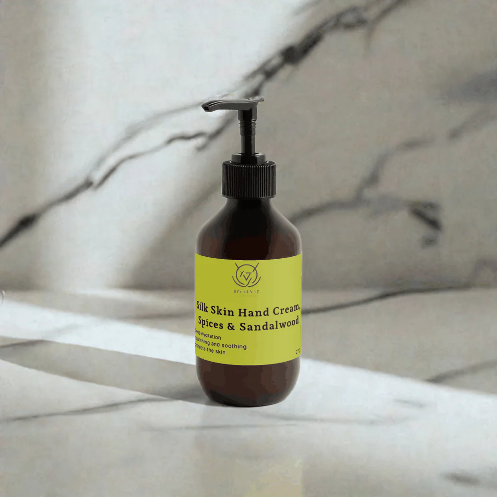 Silk Skin Hand Cream – Spices & Sandalwood is a luxurious, fast-absorbing hand cream made to deeply moisturize and soothe dry, chapped skin. Enriched with Sunflower Seed Oil and Cocoa Seed Butter, it leaves hands feeling soft, smooth, and comfortably protected—without a greasy residue.